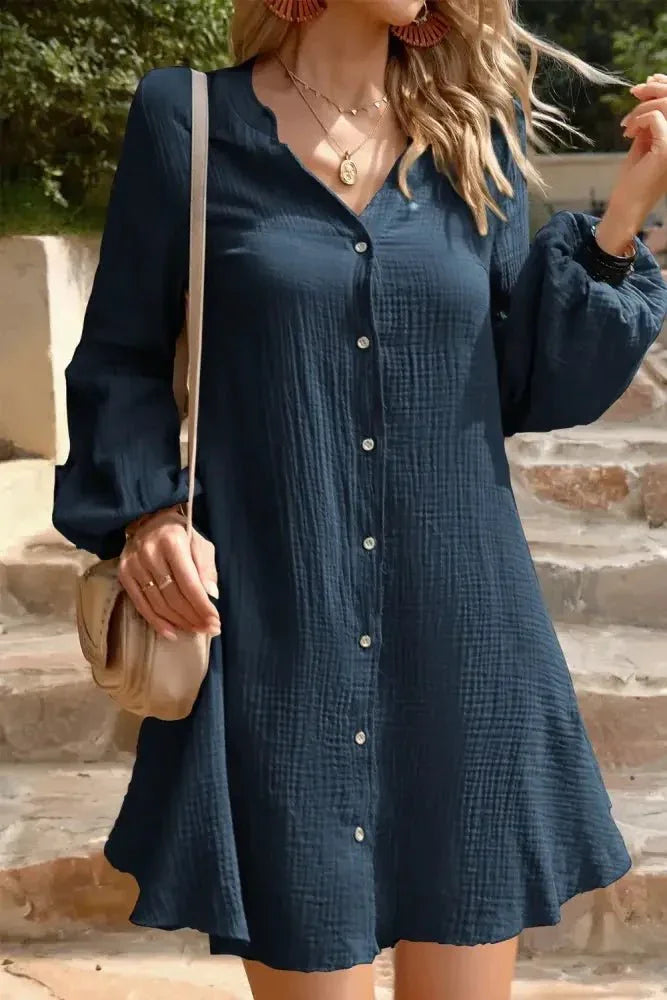 Step into a world of elegance with our Devine Notched Balloon Sleeve Mini Dress. Crafted from 100% premium cotton, this dress combines comfort with chic style, making it the perfect choice for any occasion—from brunch with friends to evening strolls under the stars. Its unique notched neckline and balloon sleeves add a touch of whimsy, ensuring you stand out in every crowd.