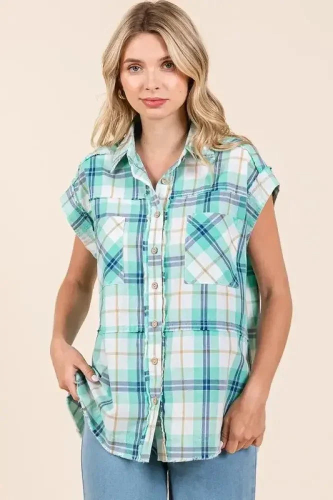 The Mineral Wash Plaid Button Down Shirt offers a unique twist on a classic wardrobe staple. Featuring a mineral wash finish, this shirt has a trendy and edgy look that sets it apart from traditional plaid shirts. The button-down design adds a touch of sophistication and versatility, allowing you to style it in various ways. The plaid print adds a timeless and versatile element to the shirt, making it perfect for both casual and more polished outfits. Pair it with jeans for a laid-back look or layer it over a dress for a chic ensemble. Elevate your style with the Mineral Wash Plaid Button Down Shirt as a modern and fashionable piece in your collection.