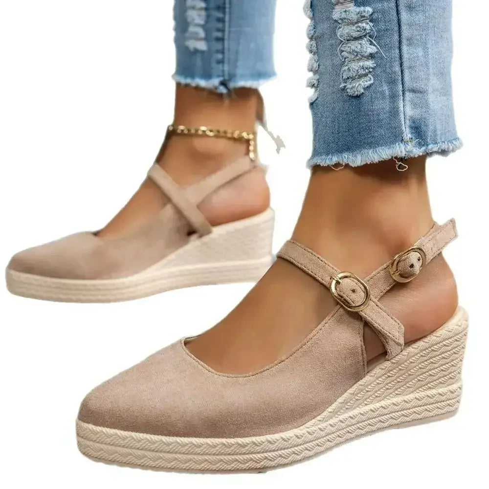 These stylish Point Toe Block Heels Pumps feature a sophisticated pointed toe design combined with a comfortable block wedge heel. Crafted with premium suede-like material in rich brown tone, these pumps offer both elegance and comfort. The distinctive espadrille rope-wrapped sole adds a fashion summer vibe while the adjustable ankle strap with buckle closure ensures a secure fit. The platform wedge design provides extra height while maintaining walking comfort. Perfect for both casual and semi-formal occasions, these versatile pumps complement various outfits from jeans to dresses. The closed-toe silhouette offers a professional appearance suitable for work or special events.