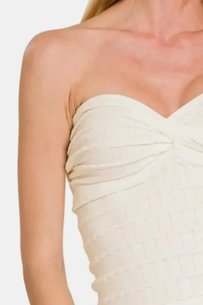 A ruched twisted sweetheart neck top typically features gathered fabric along the bust line creating a flattering and textured look. The twisted sweetheart neckline adds a feminine touch to the top, making it a fashionable choice for various occasions. This style of top is versatile and can be paired with jeans for a casual look or dressed up with a skirt or trousers for a more formal outfit.