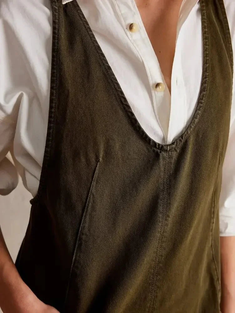 Oversized V-Neck Denim Tank Dress with Front Pockets