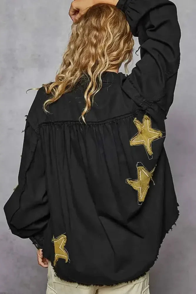 POL Star Patch Raw Hem Button Up Denim Jacket