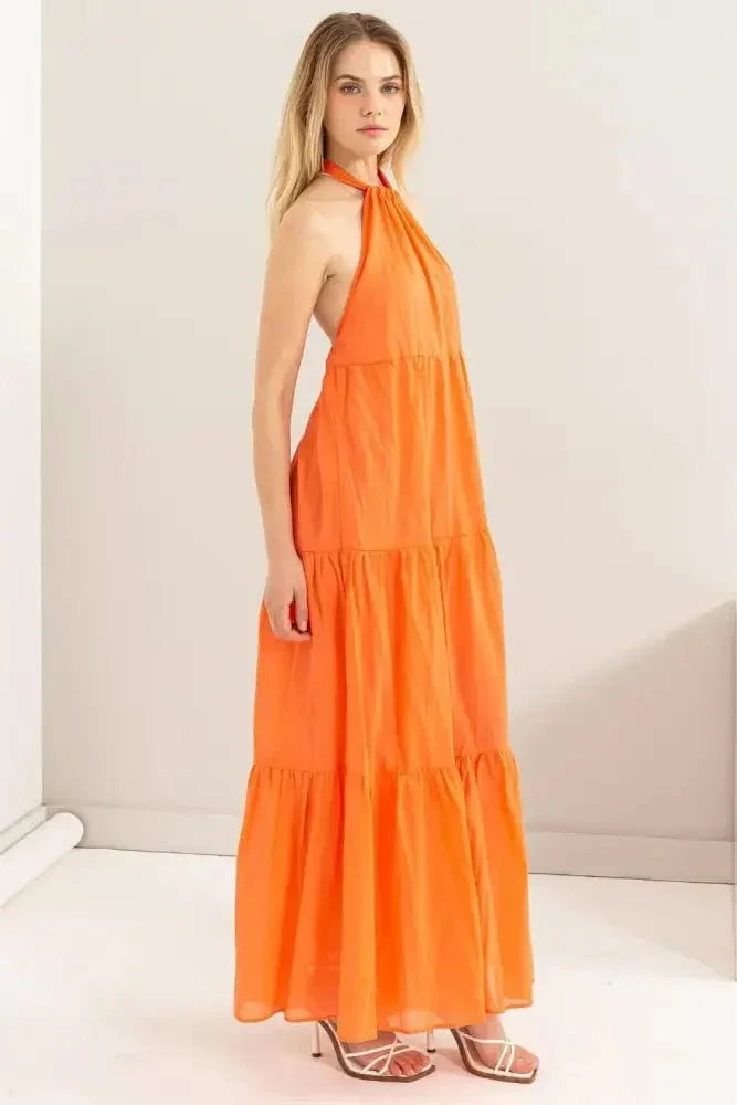 This cotton voile dress features a tie-back halter neck and a loose-fit tiered maxi silhouette, making it ideal for warm days or tropical getaways. The open-back design adds a carefree vibe to the overall look.