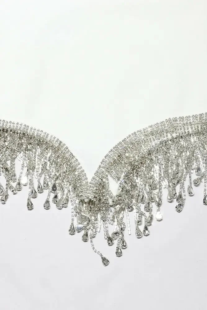 - Features: Sleeveless, rhinestone tassel detail, mini