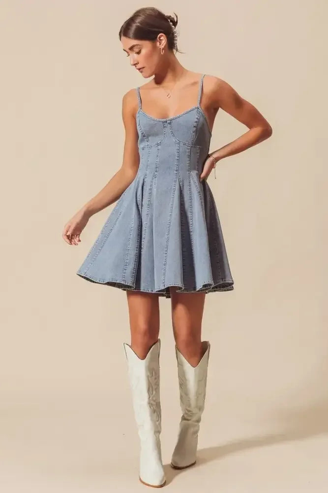 This denim mini dress features an A-line fit and flare silhouette for a flattering and feminine look. The design is stylish and versatile, perfect for casual or dressed-up occasions. The denim fabric adds a classic touch to the dress, making it a timeless wardrobe staple. Elevate your style with this chic A-line fit and flare denim mini dress for a trendy and fashion-forward outfit.