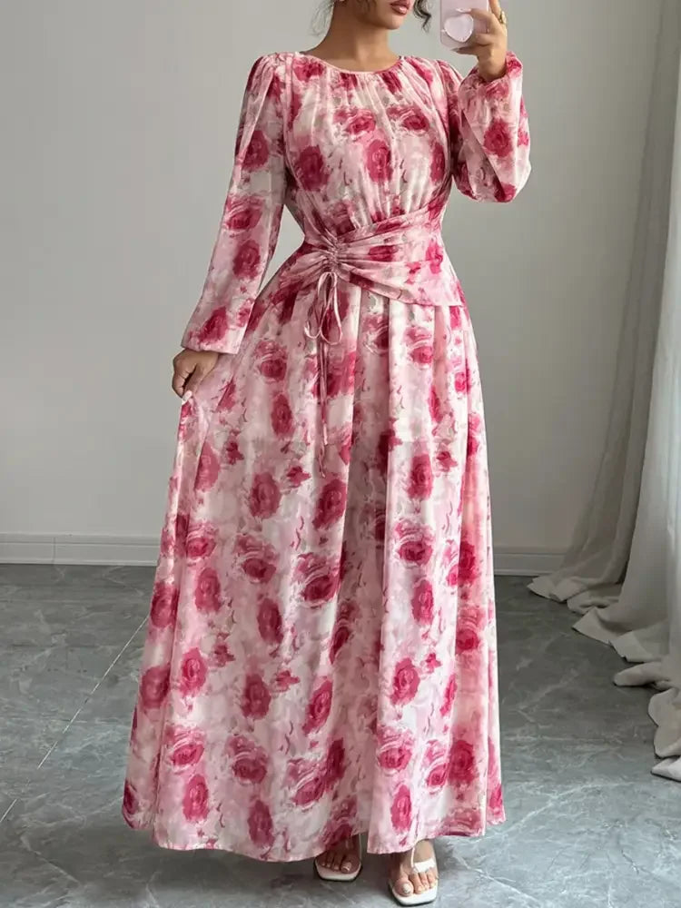Floral Long Sleeve Maxi Dress with Drawstring Detail