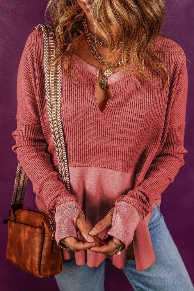 Notched Neck Long Sleeve Slit Blouse - Update AvenueTrendsi100101573458606100101573458606b22a952cb3b4499984c38190bc4e60bd - MaxWatermelon pink