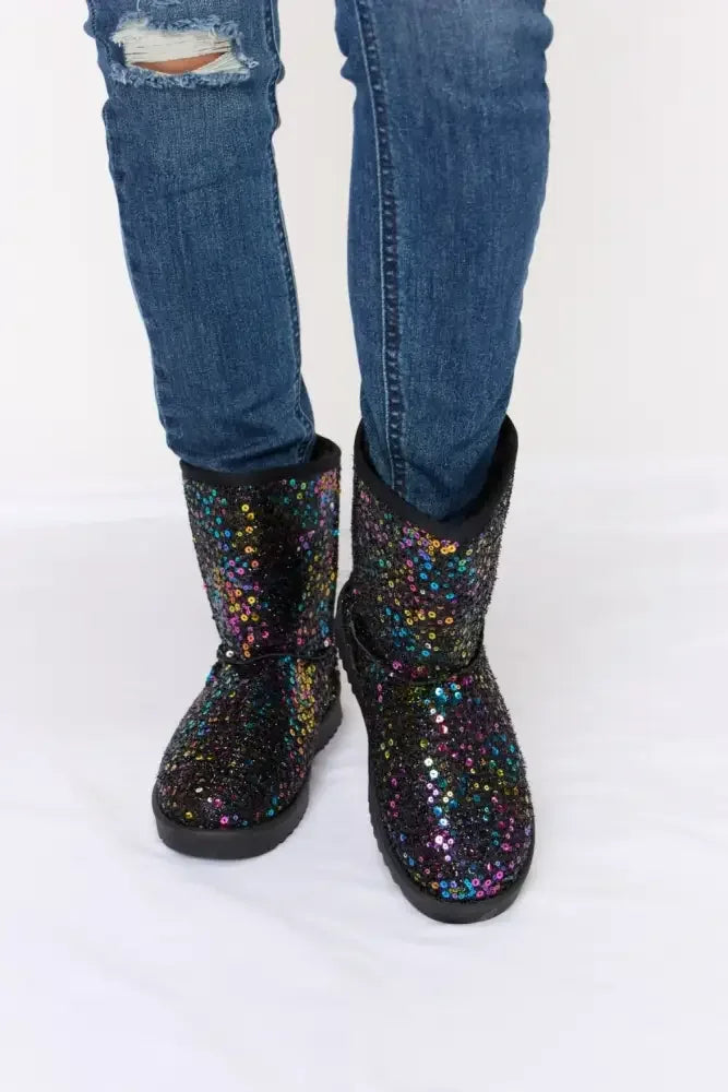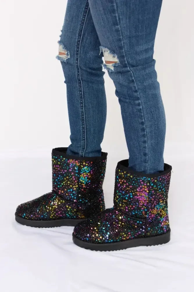 Sequin Thermal Flat Boots are the perfect blend of style and warmth. With their sequin detailing, these boots add a touch of sparkle and glamour to your winter wardrobe. The thermal lining keeps your feet cozy and protected from the cold weather. Whether you're braving the winter streets or heading out for a night on the town, these flat boots will keep you stylish and comfortable. Step out in confidence and make a statement with these sequin thermal flat boots.