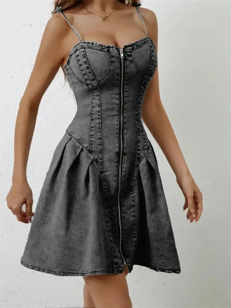 Ruched Zip Up Spaghetti Strap Denim Dress