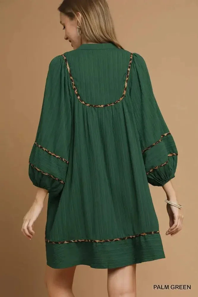 Umgee Textured Babydoll Dress with Leopard Trim - Update AvenueCasual DressesTrendsi100100242031616100100242031616Umgee Textured Babydoll Dress with Leopard TrimPALM GREEN