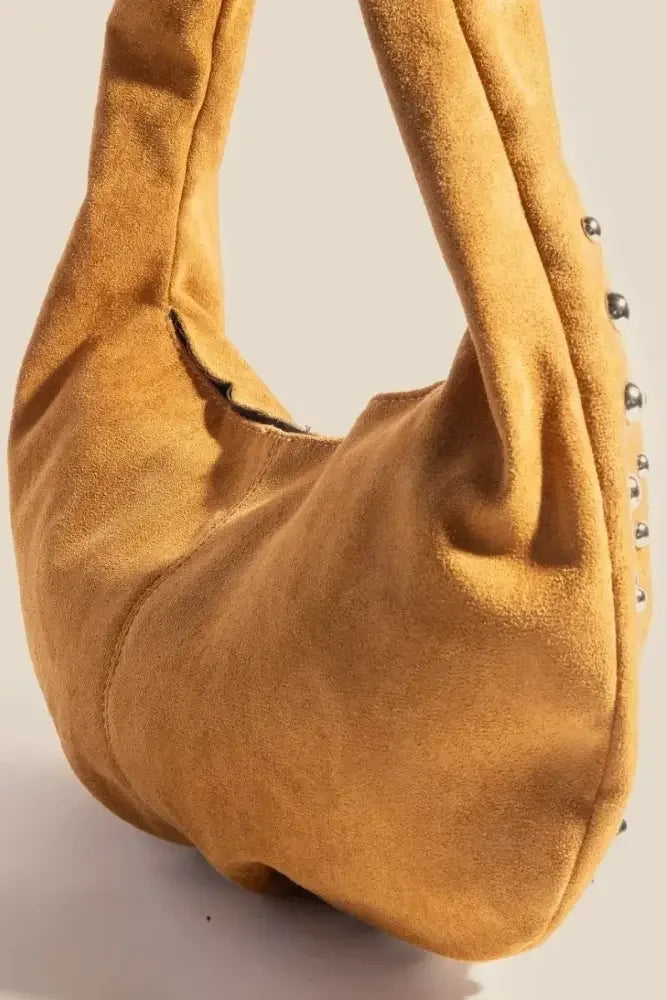 This luxurious hobo shoulder bag features buttery-soft suede leather in a rich caramel tone, adorned with edgy silver studs along the curved bottom edge. The relaxed hobo shape offers generous storage space while maintaining a sophisticated silhouette. The single shoulder strap provides comfortable all-day wear, while the magnetic closure ensures quick access to belongings. Perfect for both casual outings and evening events, this bag combines bohemian charm with modern edge through its studded detailing. The premium suede material adds texture and warmth to any outfit, making it an ideal accessory for fall and winter seasons.