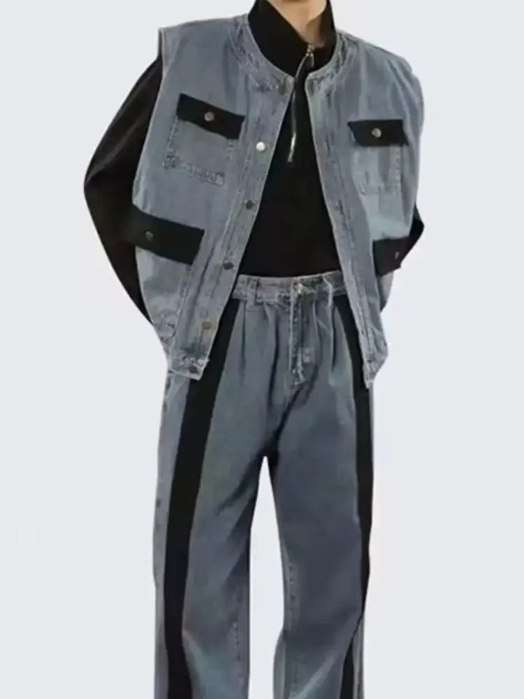 Men's Plus Size Button Up Vest and Pants Denim Set